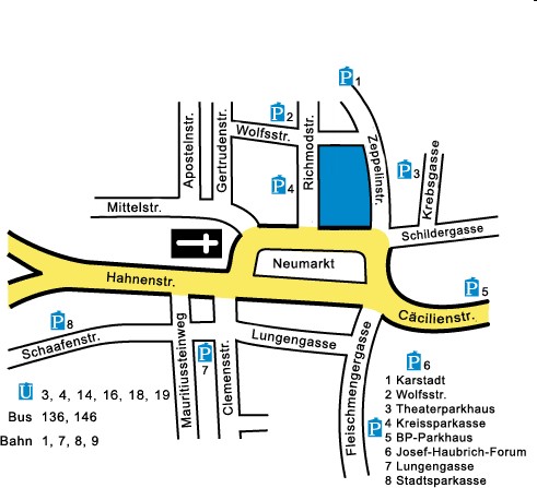 Anfahrt mit dem AutoWenn ihr mit dem Auto kommt, dann lasst ihr euch am besten von einem Routenplaner, wie zum Beispiel OpenRouteService, Google oder Map24 eine Wegbeschreibung geben.Der Neumarkt darf nur zum be- und entladen (für Infostände etc.) genutzt werden. Euer Auto könnt ihr aber auf einer der zahlreichen Parkmöglichenkeiten um den Neumarkt herum abgestellt werden. Diese sind auf der Karte weiter oben abgebildet. Die Auffahrt zum Neumarkt befindet sich auf Höhe Richmodstraße. Anfahrt per Bahn (vom Kölner Hauptbahnhof zum Neumarkt)Verlasst den Hauptbahnhof Richtung Innenstadt / Dom. über den Bahnhofsvorplatz, die Treppen Richtung Dom hoch.Rechts am Dom vorbeigehen, den Domplatz überqueren und auf die Hohe Straße. 5 Minuten Hohe Straße, nach rechts auf die Schildergasse abbiegen und nach weiteren 5 Gehminuten seid Ihr auf dem Neumarkt. |
